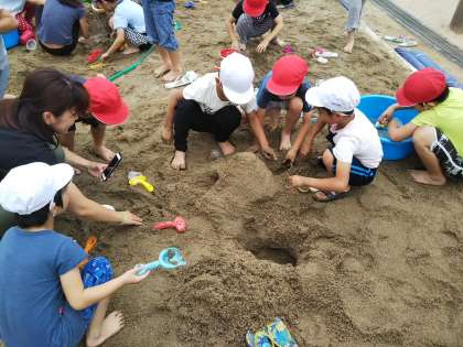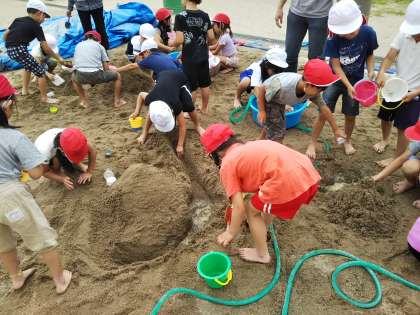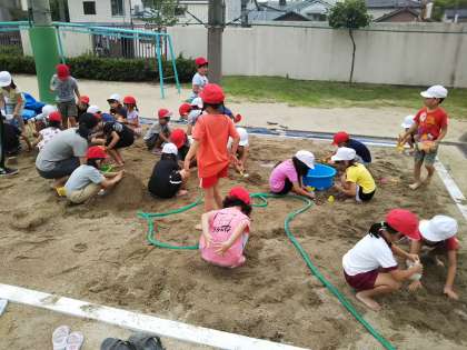砂場に水を注ぎながらどろ遊びに夢中です。大きな山やトンネル、プリン等を楽しそうに作っていました。
