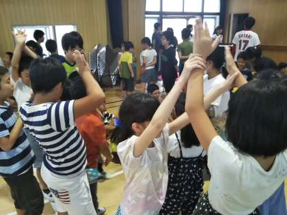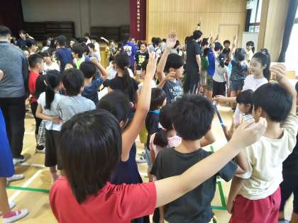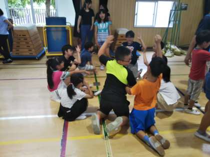ファミリーで「リーダーが言うことと反対のことをしないと負け」というゲームに取り組みました。例えば「右手をあげて」と言われたら右手をおろさなければなりません。皆で楽しく盛り上がっていました。