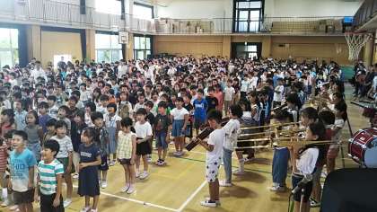 体育館で2学期始業式を行いました。校歌斉唱、校長先生の話、水泳記録会の表彰、4年生代表児童の目標発表が行われました。