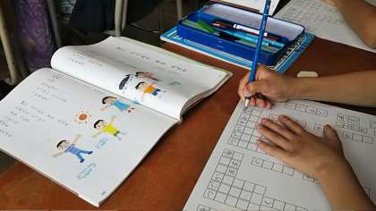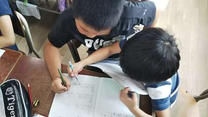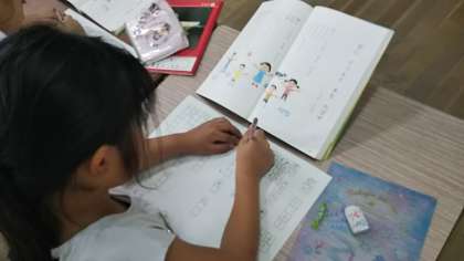 国語科では、姿勢を正して一文字一文字丁寧に視写を行っています。算数科では、自分の考えをペアで伝えあって取り組んでいました。