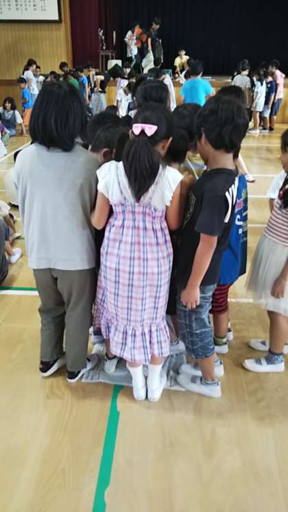 ファミリーで、新聞紙の上に何人乗れるか競いました。声をかけあって、仲よく取り組みました。