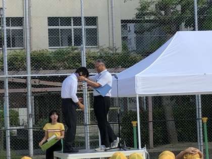 校長先生から、昨日の敬老会に出演した皆さんのがんばりについて紹介がありました。また、100?ウルトラマラソンを見事完走した教頭先生にメダルの授与があり、経験談を聞かせてもらいました。