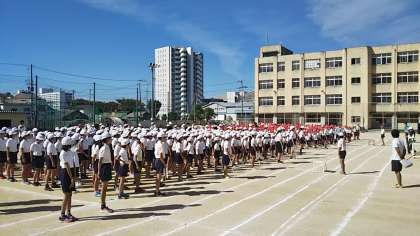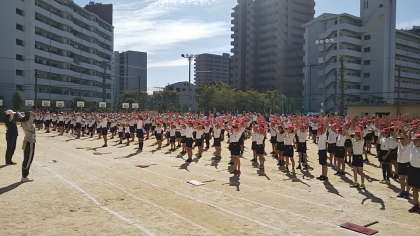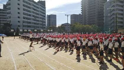 開閉会式、ラジオ体操、応援歌の全体練習を行いました。説明をしっかり聞いて、きびきびと動いていました。