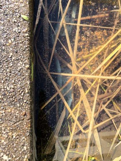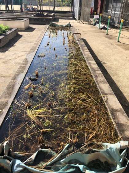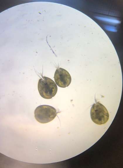 稲刈りを終えた田んぼに1mmもない小さな生物がたくさん発生していました。理科室のビーカーですくい取り、顕微鏡で観察すると、二枚貝のような形の生物でした。おそらく、カイミジンコだと思われます。田んぼに栄養があり、水がきれいであれば発生するそうです。