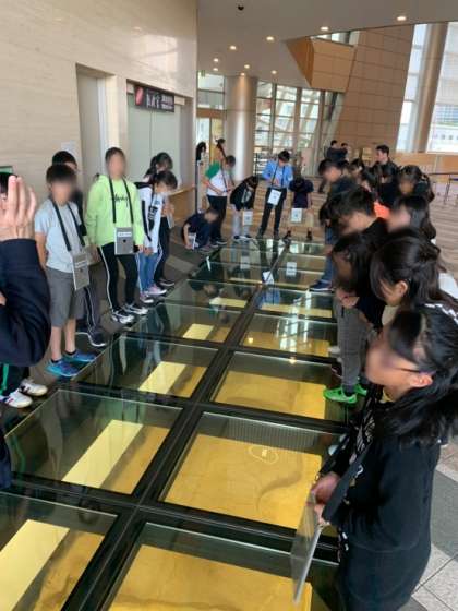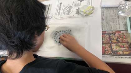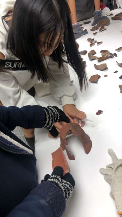 床下の遺跡を見たり、破片の組み合わせを体験したり、瓦の文様を写したりしました。