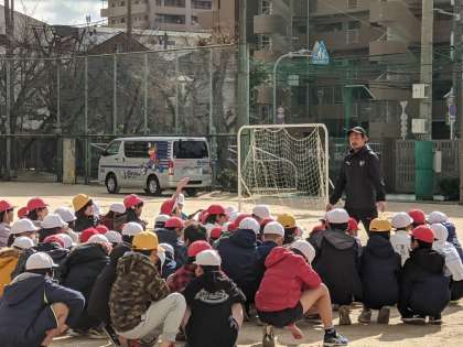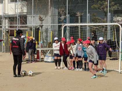 セレッソ大阪のスタッフの方に授業をしていただきました。気がつけば、みんな夢中になってボールを追いかけていた、そんな素晴らしい授業でした。寒いどころか、「暑い!」と、上着を脱ぎ、半袖体操服になる子がたくさんいました。サッカーの楽しさを大いに味わうことができました。