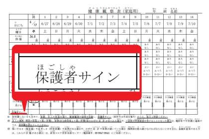 また、健康観察表(6月27日〜7月10日)でもお知らせしたように、保護者サイン欄へのサインをお願いします。