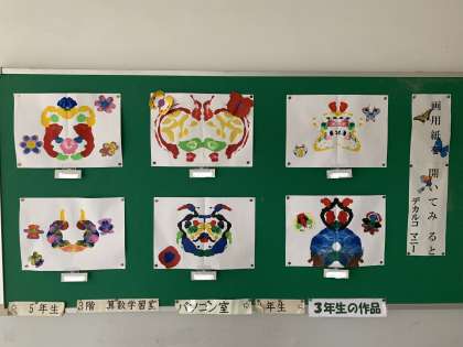 左が3年生の作品で、画用紙を半分におり、片側に描いた絵の具がもう片方にもうつることで、とても素敵な作品になっています。