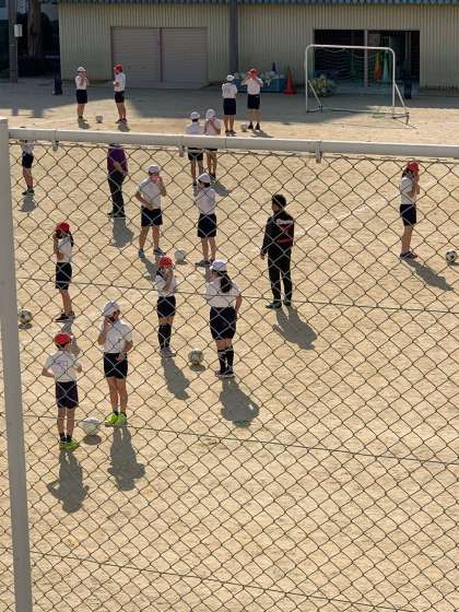 コロナウイルス感染症の状況がまだまだ落ち着かない中ですが、サッカーのセレッソ大阪からコーチの方2名が鴫野小学校に来て、5年生に楽しくサッカーが好きになるような授業を行ってくれました。