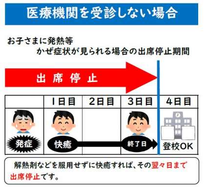 医療機関を受診した場合と受診しなかった場合の出席停止期間は従来通りです。