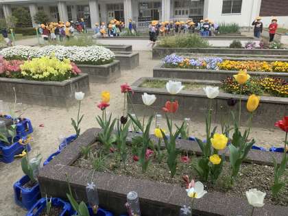 中庭にはきれいなお花がたくさん咲いて、1年生が楽しく過ごしています。