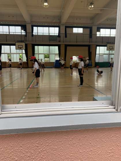 講堂をのぞいてみると、ソーシャルディスタンスを確保しながら、2年生が体育をしていました。