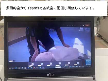 多目的室でたくさん集まることができませんので、多目的室で講師の先生が実際にやっているところをTeamsで配信し、先生方は教室で映像を見、グループごとに順番に多目的室で実技を行いました。