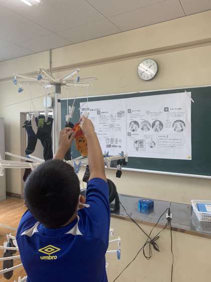 5時間目に家庭科室を見ると、6年生が授業で洗濯をしていました。