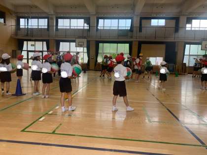 さて、講堂では、1年生と6年生が合同で体育の授業を行っていました。異学年交流は鴫野小学校が大切にしている取り組みです。6年生がとてもやさしい素敵な顔で1年生に対応している姿が見られました。1年生もとても楽しそうです。