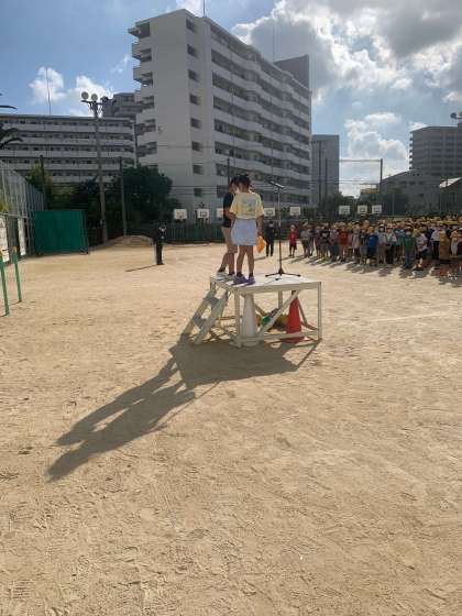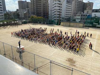 緊急事態宣言中は教室でTeamsによる全校朝会を行っていましたが、解除されましたので久しぶりに運動場で全校朝会を行いました。