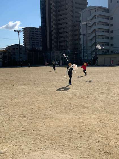 運動場では、1年生が自分たちで作った凧をあげています。