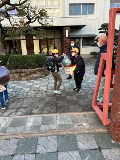 昨日の全校朝会でお知らせがあったとおり、朝の正門では保健委員会がペットボトルキャップを集めています。