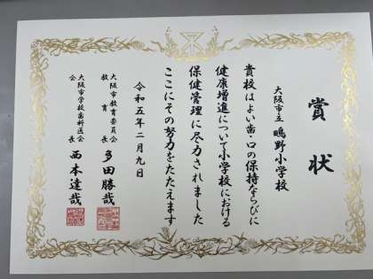 教育委員会及び大阪市学校歯科医会よりよい歯の学校の表彰を受けました。
