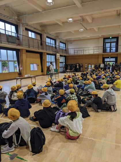 今、講堂で出発式を終えました。