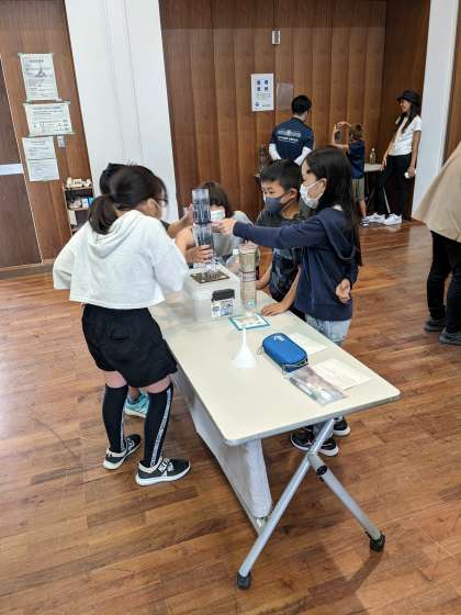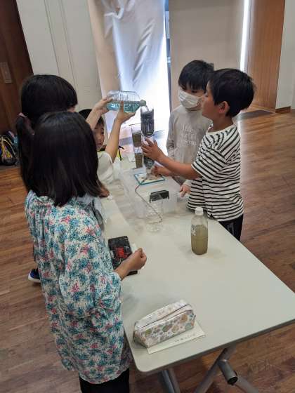 においを取り除くために粒状活性炭の入ったペットボトルに、先ほどの水を入れます。すると、、においが消えました!簡易装置でも原理は同じです。みんな実験を通してしっかり学べましたね。