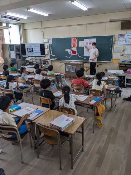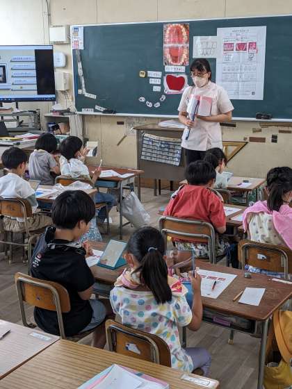 本日、歯科衛生士さんにご来校いただき、2年生を対象に歯磨き指導が実施されました。大きな歯ブラシを使い、正しい歯の磨き方を教えていただきました。