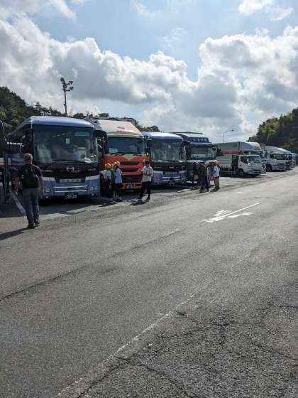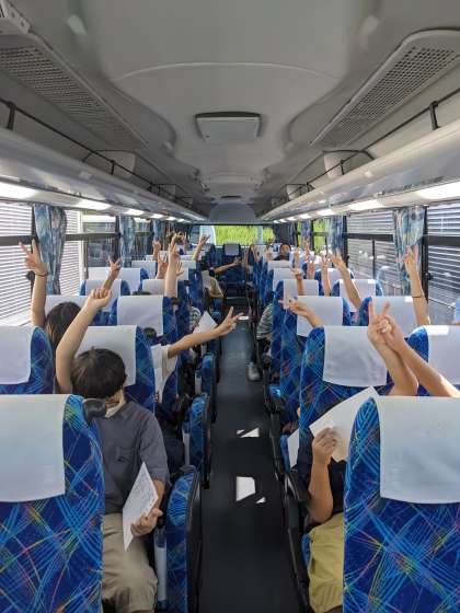 ここからバスの中では、音楽が流れ出しました。楽しい道中です!
