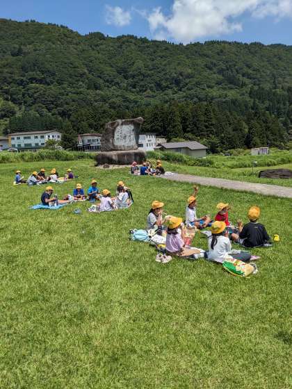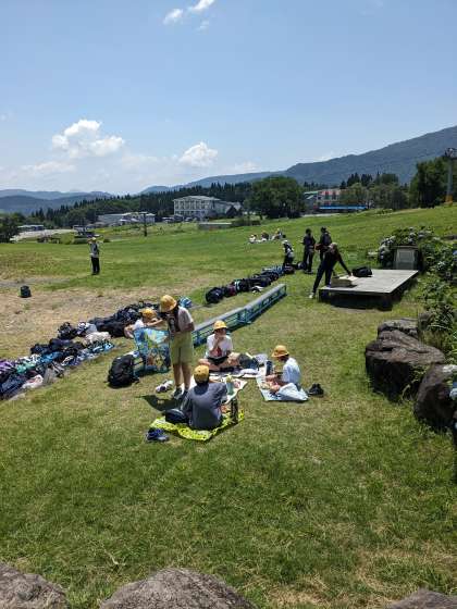 活動班でお弁当です!暑いですが風が心地よいです。午後の活動に向け、しっかり食べましょう。