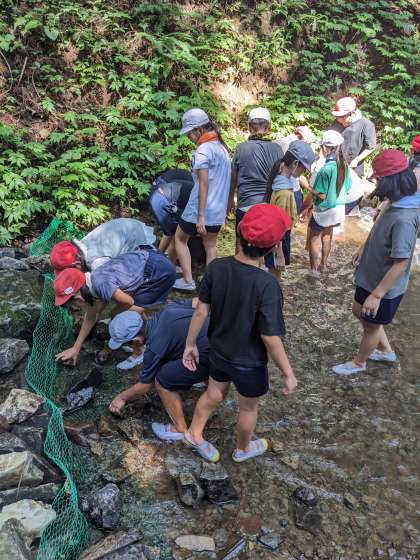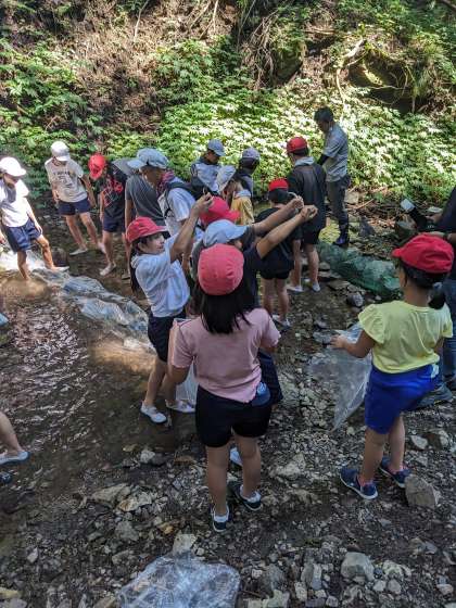 宿舎の裏手にある川へ移動し、魚つかみの活動が始まりました!捕まえる魚はアマゴです。上手に両手を使い、歓声と共にアマゴを捕まえてます!