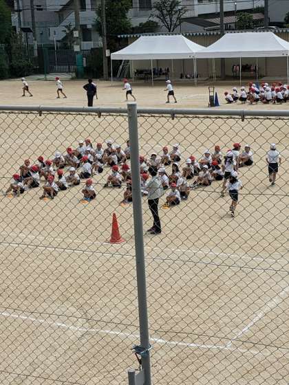 2年生の体育科です。運動会の練習で、徒競走の練習をしました。どこの場所から走るのか、覚えたかな。