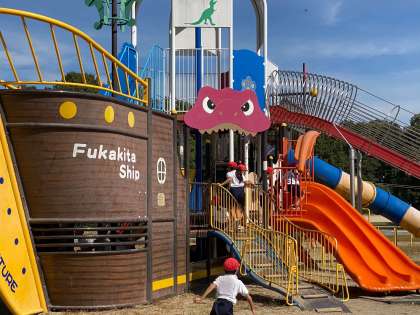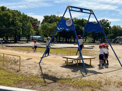 深北緑地公園に着き、クラス毎にローテーションで、芝生遊び、どんぐり拾い、遊具遊びに取り組んでます。天気も最高です!