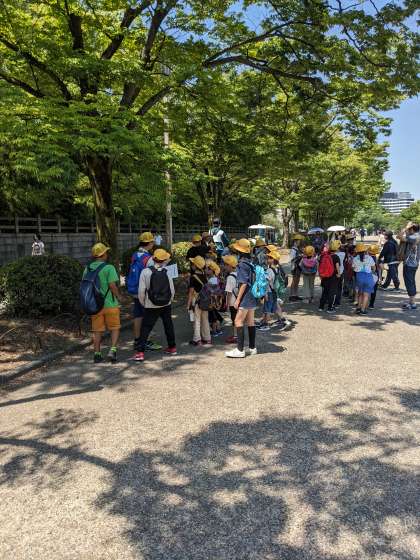 ポイントではクイズに答えます。わかるかな?日陰でお茶を飲み休憩もしながら、天守閣を目指します。あと少しです!