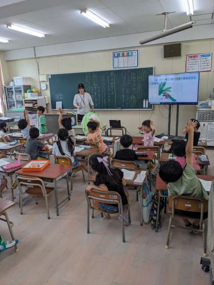 1年生の国語です。『おおきなかぶ』のお話です。先生が用意されたおおきなかぶを目の前にして、話し合いが盛り上がってました!