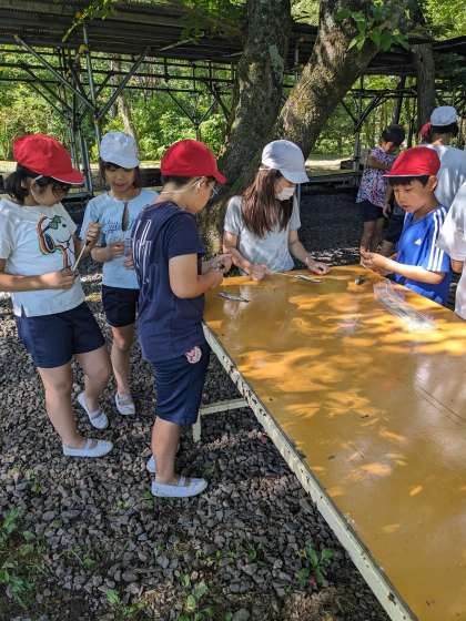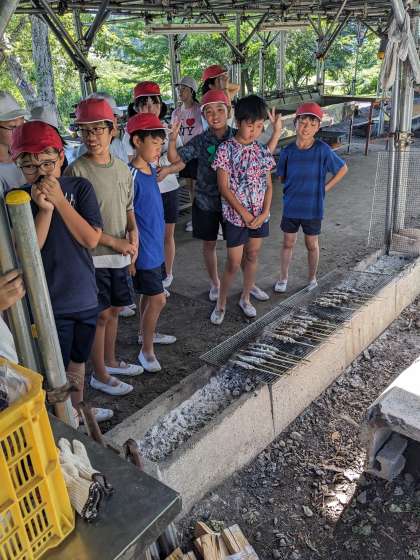 串に刺したアマゴを炭火で焼き、すぐに熱々を食べます。お味はいかがかな?