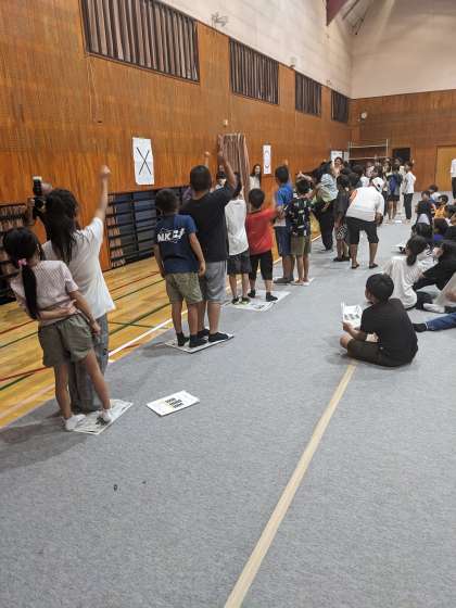 2人組で新聞紙にどこまで乗ってられるのか?じゃんけんに負けたら新聞紙を半分に折っていきます。頑張ろう!