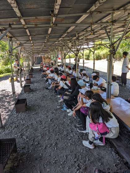 カレーライスを食べたら、次の活動は焼き板作りです。まずは宿舎の方から説明を聞きます。
