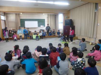 また、同じ日に1年生と2年生がおもちゃ祭りをしました。1年生が、2年生の手作りのおもちゃで楽しく遊びました。1年生は、2年生の手作りのおもちゃで夢中で遊んでいました。2年生も、1年生に親切に遊び方を教えていました。