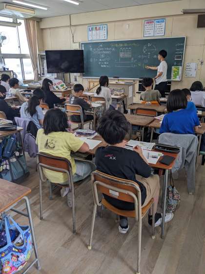 6年生の算数です。分数?整数の計算の仕方について学んでいます。複雑な計算ですが図を用いてじっくりと考えています。