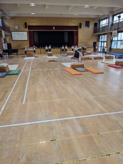 跳び箱運動です。抱え込み跳びや台上前転に挑戦していました。みんな息を弾ませ、何度も練習しています!
