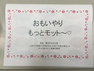 鴫野地域活動協議会と、鴫野小学校児童会が共同で作成した、あいさつ・感謝の標語「おもいやり もっとモット〜♡」が、完成しました。それに伴い、下記の場所に掲示されますので、お知らせさせていただきます。
