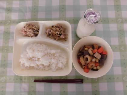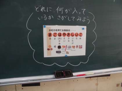 おなかをすっきりさせる健康メニューということで、「まごは(わ)やさしいこ」という頭文字をとった食べものがすべて献立のなかに入っています。給食委員会の子どもたちが朝の全校集会で紹介し、給食時間中には各食材を探す子どもたちの姿が見られました。給食を通して食べることへの関心が高まるとよいですね。