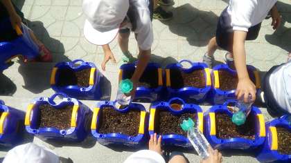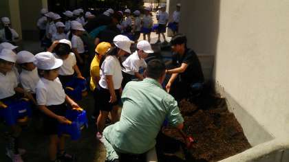 一人一鉢を持って、土や肥料を入れました。最後にあさがおの種をまきました♪夏にはきれいな花を咲かせてくれることでしょう!!
