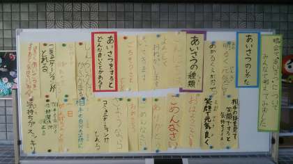 児童会を中心として、「あいさつれんじゃー」のたすきをかけた皆さんが、朝から元気いっぱい声をかけています。あちこちで元気なあいさつがとびかうといいですね♪