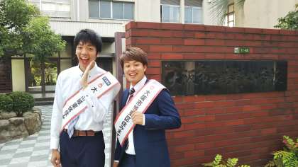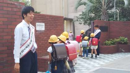 城東区住みます芸人『アンプリ』のお二人が、登下校時に「おはようございます」「さようなら」と元気いっぱいの挨拶をしてくれました。