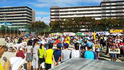秋晴れのもと、多くの参加者が集いました。鴫野小学校鼓笛隊の演奏で開会式が始まり、児童によるアナウンスで会場を盛り上げました。
