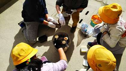 昔のくらしを知ろうと、七輪でもちを焼きました。焦げ目がついておいしく焼けました。