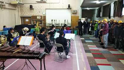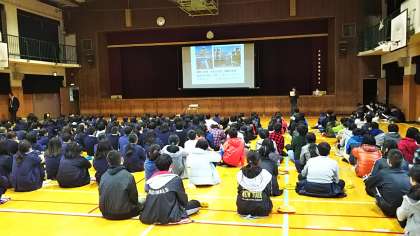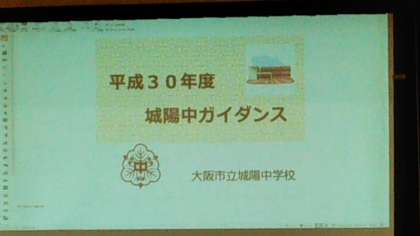 4つの小学校が中学校に集まりました。生徒会の皆さんから学校の概要を聞き、授業やクラブを見学しました。