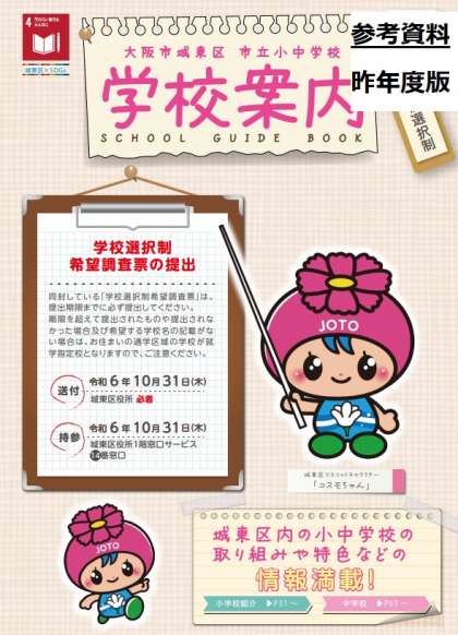 詳しくは、近日中に城東区役所から配付される、【令和8年度新入学生向け 学校選択制にかかる大阪市城東区市立小中学校「学校案内」】をご覧ください。