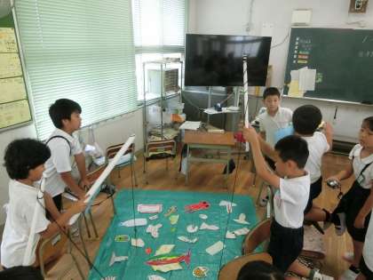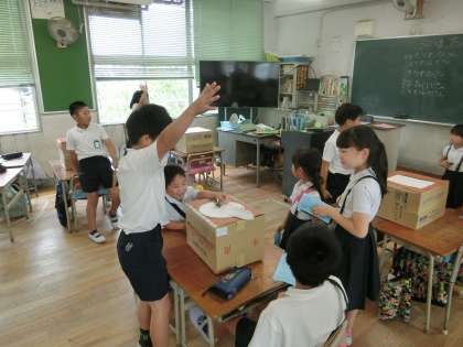本日児童会活動の取り組みとして、中浜フレンドリーランドを行っています。なかよし班でお店を出し、店番側と客側と交代しながら活動しています。どの店も工夫されており、子どもたちは楽しそうに活動していました。