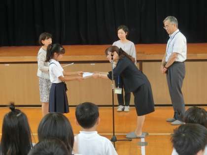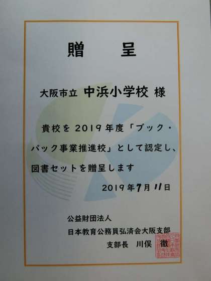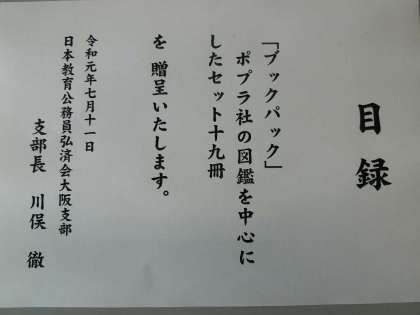 本日、日本教育公務員弘済会大阪支部の方からブックパック(図鑑を中心に19冊)を贈呈していただきました。調べ学習等に活用させていただきたいと思います。